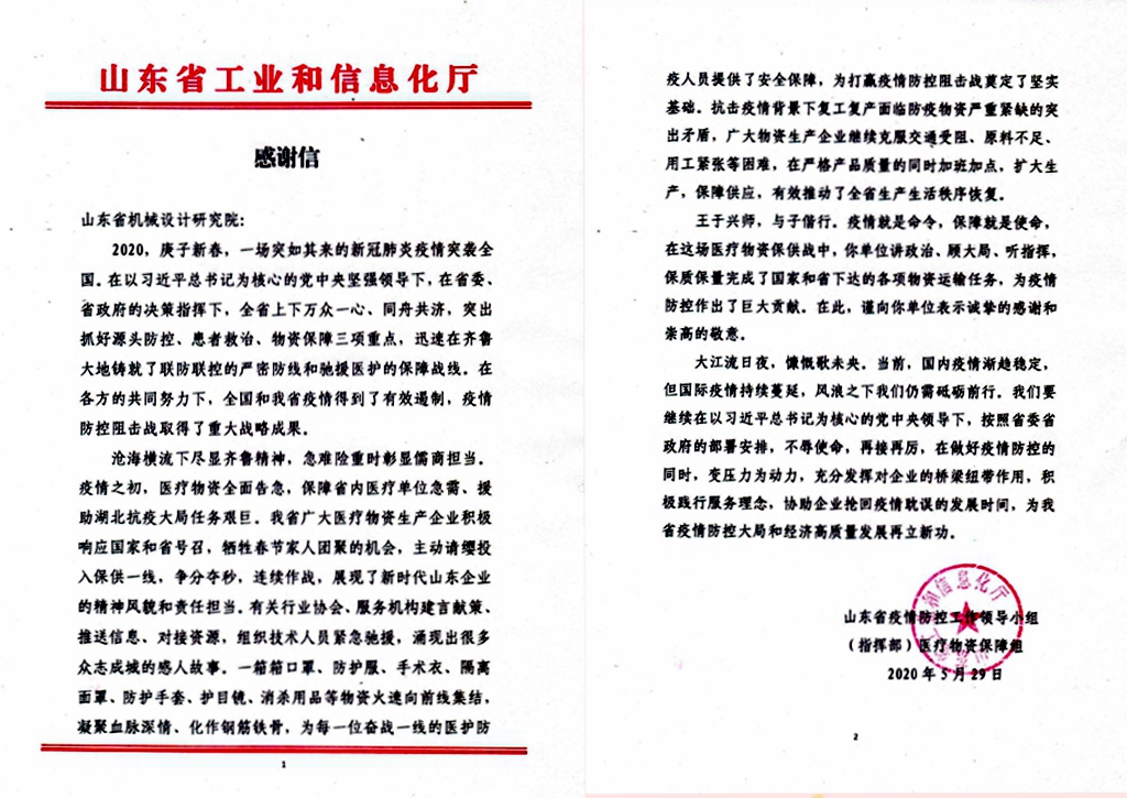 5月29日,山東省疫情防控工作領導小組醫療物資保障組向山東省機械設計研究院發來感謝信,對在疫情防控工作中做出的巨大貢獻表示誠摯的感謝和崇高的敬意。