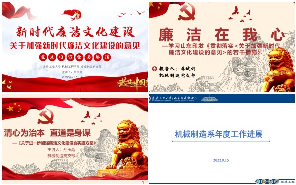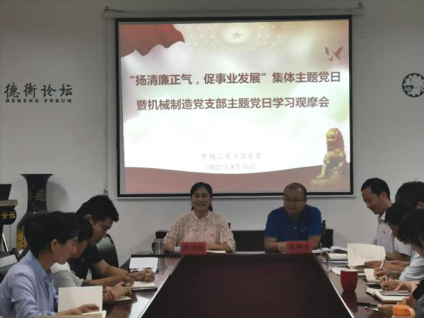 9月15日下午,機械工程學部組織了主題為“揚清廉正氣,促事業發展”的集體主題黨日活動,活動采取線上線下結合進行的方式,采用由機械制造黨支部承辦、學部全體黨員參與的新模式進行。學部全體黨委委員、紀委委員及全體黨員參加,機械制造黨支部還邀請了本系非黨員教師一同參加。活動由黨委委員、正處級組織員周瑋玲主持。