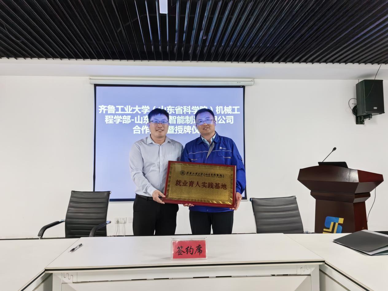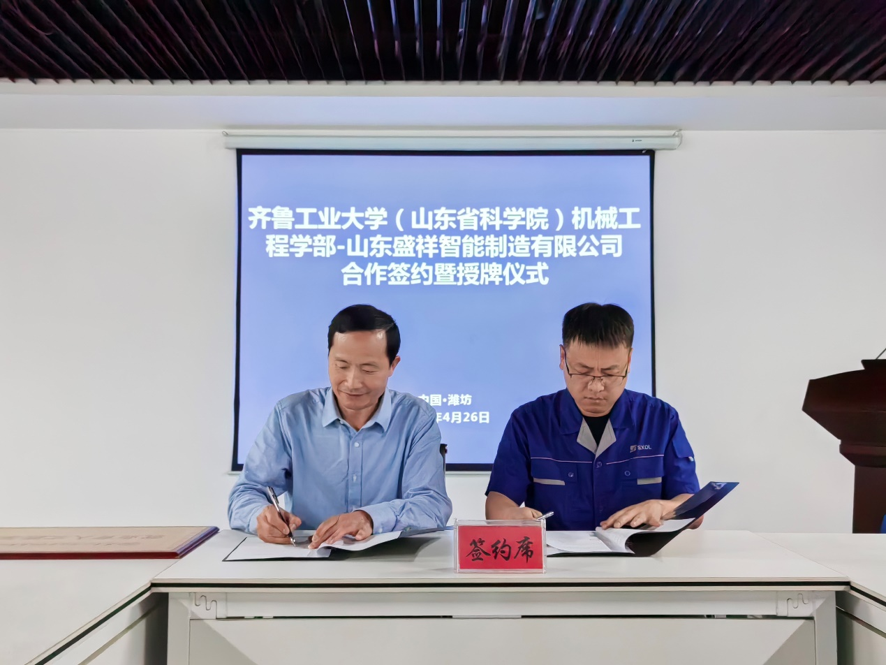 活動第三站來到山東盛祥智能制造有限公司。師生一行參觀了企業展廳以及生產車間,并舉行了校企合作簽約儀式暨就業育人實踐基地授牌儀式。學部領導宋開宇、杜勁,安丘市委組織部、市工信局、新安街道辦有關領導,盛祥智能常務副總經理、黨委書記王培信,黨委副書記兼綜合管理部部長冷冰,盛祥智能高端智造應用研究院副院長邱瑞軍等參加儀式。儀式上,宋開宇與王培信共同簽署就業育人實踐基地校企合作協議,杜勁與冷冰為“就業育人實踐基地”授牌。