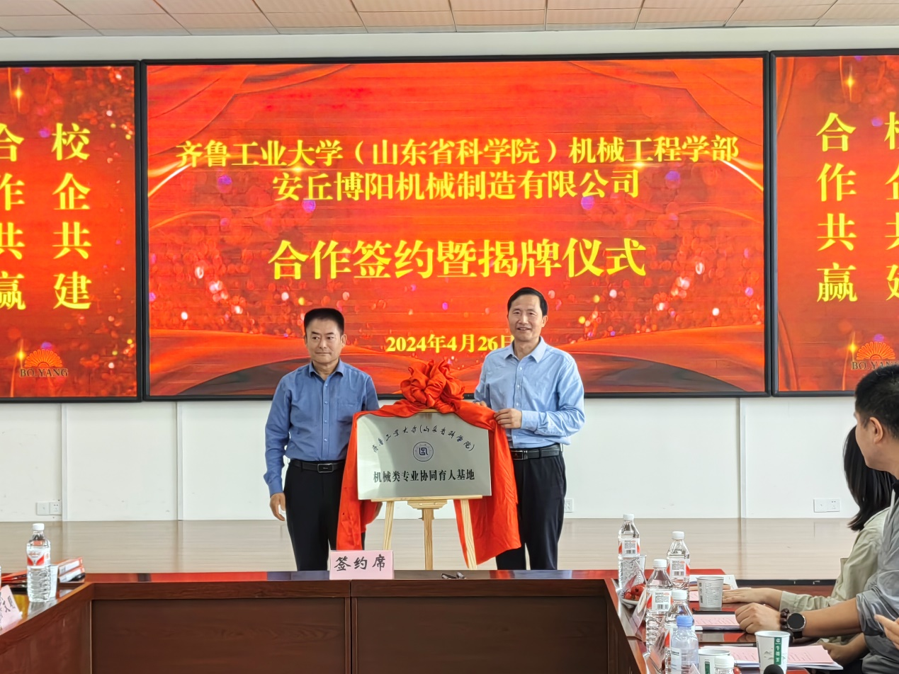 活動第二站來到安丘博陽機械制造有限公司。公司總經理閆吉祥帶領師生參觀了博陽機械文化展廳以及產品展示區,詳細介紹了公司的生產工藝、技術創新以及市場應用情況。參觀結束后,舉行了校企合作簽約暨機械類專業協同育人基地揭牌儀式。學部領導宋開宇、杜勁,安丘市委組織部科長田冬慶,安丘市工業和信息化局副局長王振,安丘市工業和信息化局黨組成員、四級調研員宋曉東,安丘市石堆鎮黨委副書記劉建珍,安丘博陽機械制造有限公司總經理閆吉祥、副總經理李文明等出席活動。儀式上,雙方簡要介紹各自情況并就今后的合作與交流等進行深入探討;宋開宇與閆吉祥進行“機械類專業協同育人基地”揭牌,杜勁與李文明簽署機械類專業協同育人基地合作協議,為雙方今后資源共享、優勢互補打下堅實基礎。