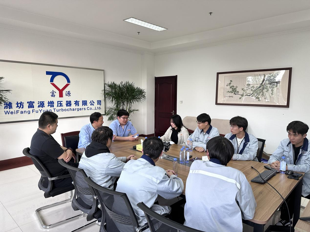 活動第一站來到濰坊富源增壓器有限公司。在公司副總經理張為海的帶領下,師生一行參觀了公司的產品展廳、生產車間等,通過觀看公司宣傳片,了解了企業發展歷程、規模現狀和發展前景。在隨后召開的校企對接座談會上,校企雙方圍繞企業生產中遇到的問題、企業技術需求情況和高校畢業生人才培養問題展開了熱烈討論;在另一場學生座談會上,已在富源工作的我校2023屆畢業生張鴻鵬與正在富源實習的我校2024屆畢業生們圍繞工作感受、畢業設計、就業規劃等進行討論,利用朋輩力量激勵應屆畢業生主動就業,力爭實現高質量就業。